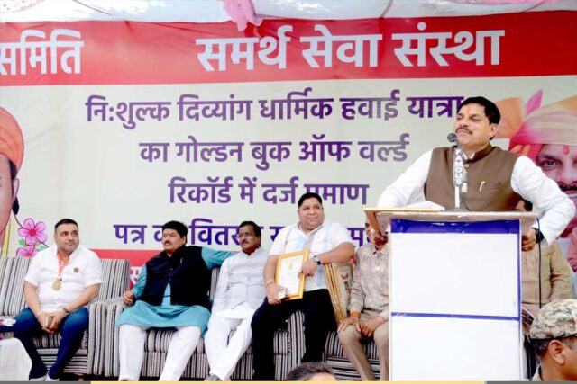गोल्डन बुक ऑफ वर्ल्ड रिकार्ड में दिव्यांग जनों को नि:शुल्क धार्मिक यात्रा के प्रमाण पत्र वितरण के पश्चात मुख्यमंत्री डॉ. यादव ने कहा कि दिव्यांग जनों की सेवा ईश्वर की सेवा के समान है। समर्थ सेवा संस्थान के द्वारा यह एक अत्यंत प्रशंसनीय कार्य किया गया है जो की सबके लिए अनुकरणीय भी है। उल्लेखनीय है की समर्थ सेवा संस्थान के द्वारा अब तक 47 दिव्यांग जनों को धार्मिक हवाई यात्रा नि:शुल्क करवाई गई है। मुख्यमंत्री डॉ यादव ने अपनी ओर से संस्था के पदाधिकारीयों को शुभकामनाऐं दी।