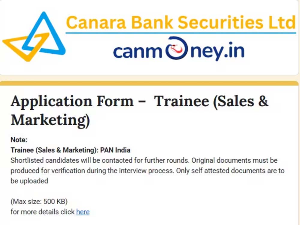 बैंकिंग और फाइनेंशियल सेक्टर में करियर बनाने की चाहत रखने वाले युवाओं के लिए शानदार अवसर आया है। कैनरा बैंक की पूर्ण स्वामित्व वाली सहायक कंपनी कैनरा बैंक सिक्योरिटीज लिमिटेड (CBSL) ने ट्रेनी (सेल्स एंड मार्केटिंग) पदों के लिए भर्ती का नोटिफिकेशन जारी किया है। खास बात यह है कि इसमें उम्मीदवारों को लिखित परीक्षा नहीं देनी होगी, बल्कि चयन सिर्फ इंटरव्यू के आधार पर होगा। कंपनी ने आवेदन की अंतिम तिथि 6 अक्टूबर 2025 (शाम 6 बजे तक) तय की है। उम्मीदवार ऑनलाइन या ऑफलाइन, दोनों तरीकों से आवेदन कर सकते हैं।